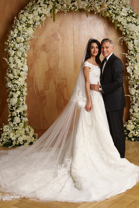 While the groom looked absolutely dapper in his Armani suit, it was Alamuddin’s iconic sense of style that had style gurus in awe. Alamuddin arrived in Italy in a lady-like ensemble consisting of a black and white ankle-length Dolce & Gabbana Spring 2013 dress. Upping the drama for her rehearsal dinner, Alamuddin was breathtaking in a red Alexander McQueen Resort 2011 gown. Keeping it simple, she donned a cream Stella McCartney trouser suit with a matching hat to her civil ceremony, and for her wedding day, she wore a spectacular Oscar de la Renta creation with French lace, pearls, an off-shoulder neckline and full train. For her post wedding-day brunch, Alamuddin stepped out in a stunning Giambattista Valli Spring 2014 Couture dress with a high and low hemline, looking every bit the stylishly fabulous bride that she is.