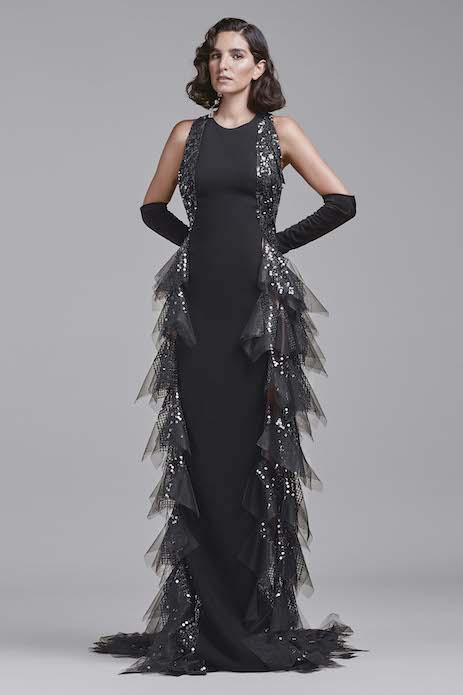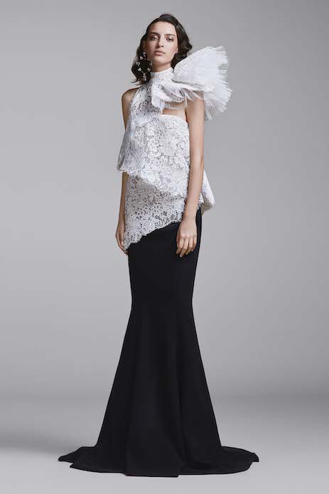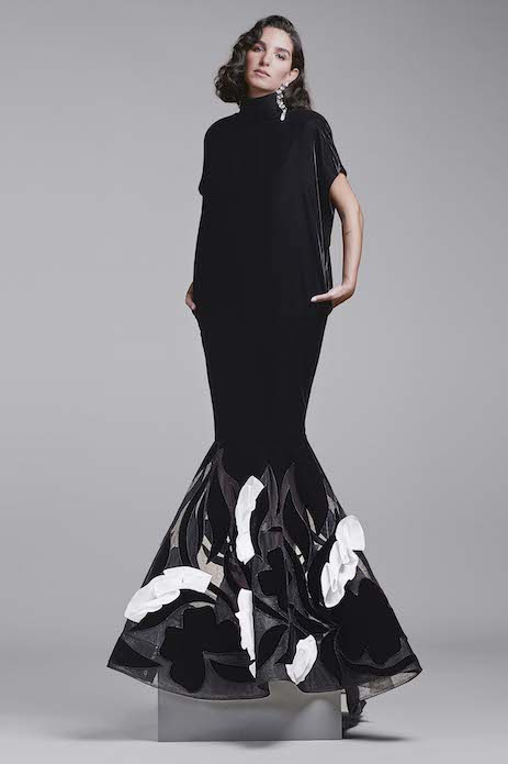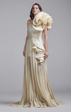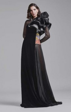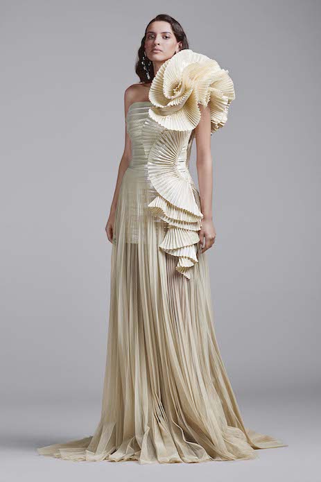 Created with resources from the House archives, the pieces in the collection are adorned with fabrics of lace, velour de soie, silk organza, and gazar. Pleats, ruffles, fans, and flames animate the gowns to move like light changing with time. Opaque meets with a glimmer of translucence creating a striking optical play.