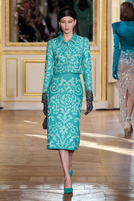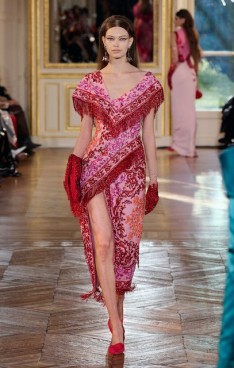 Fun and happiness was evident not only in a vibrant color palette featuring shades of red, green, pink, purple and blue, but also in light-hearted inspirations from Arabian culture. The dresses twirl in an entrancing choreography inspired by Oriental dance.