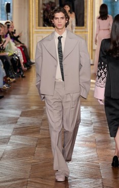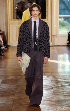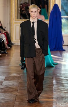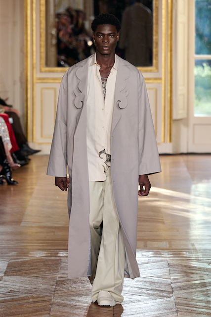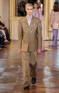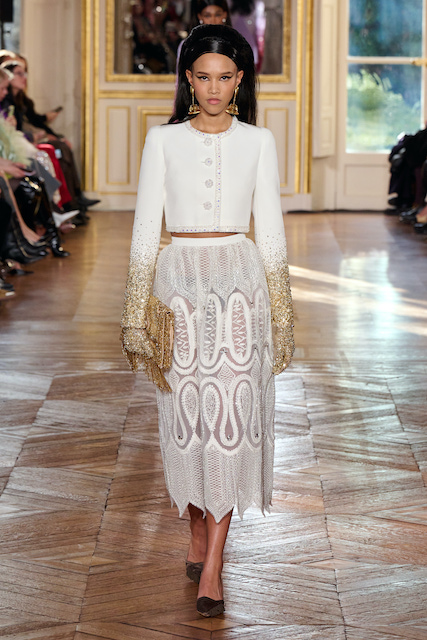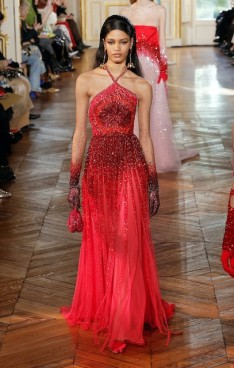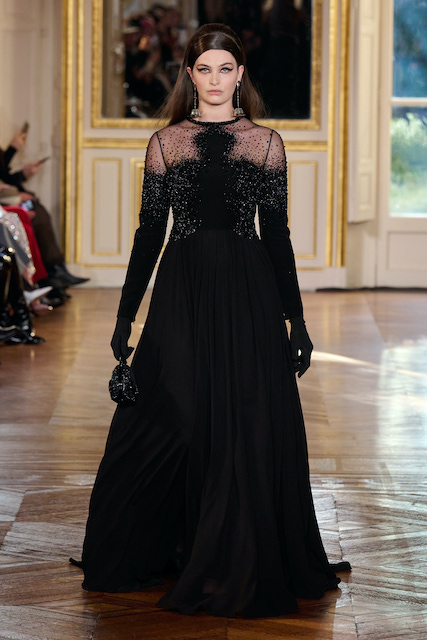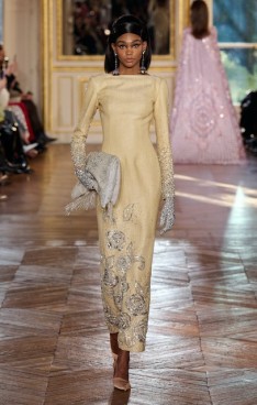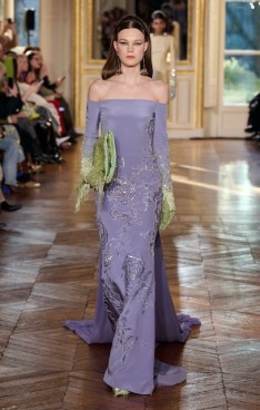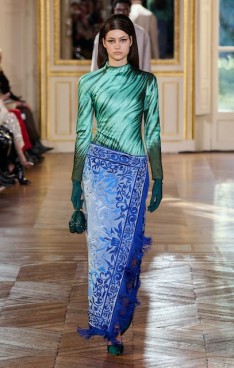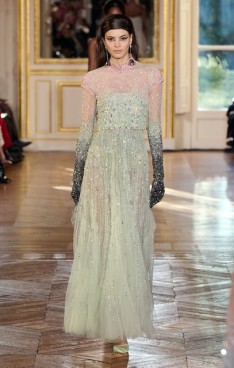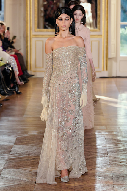 The spirit of the 1001 Nights was present in the shimmering motifs and translucent designs, with a coat as if crafted from glass. Magical tulle and muslin gowns appear to float, as simply suspended on the body.