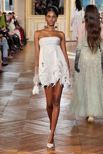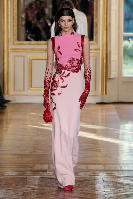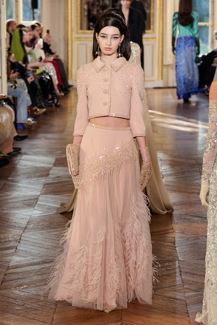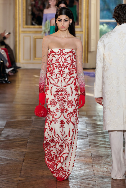 A treasured garden appeared in the intricate embroideries which are a Maison GEORGES HOBEIKA trademark, alongside highly detailed thread work with a contrasting texture, replicating the tapestry and fringes of a rug.