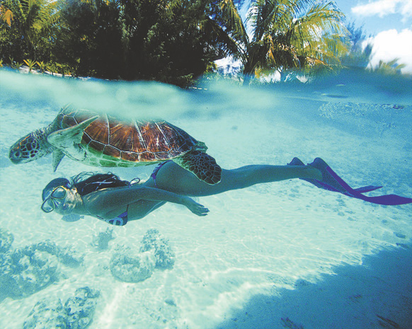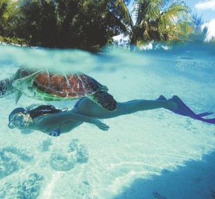 Le Meridien Bora Bora has the best views of fish under your overwater bungalow. Peer through the glass to see manta rays and schools of colorful fish gracefully gliding below your hut. This hotel also has the best view of Mount Otemanu, and boasts a turtle sanctuary. Rise early to watch the morning feeding of the turtles and later swim among them in the lagoon!