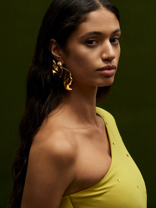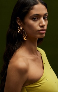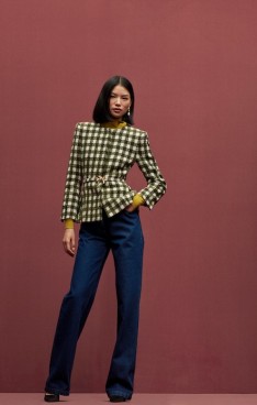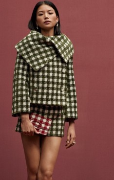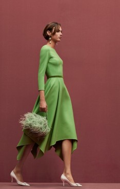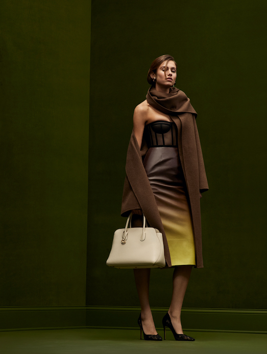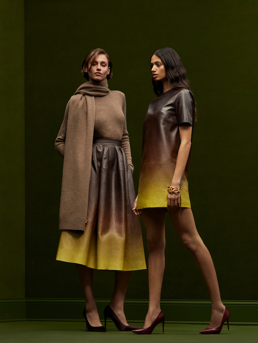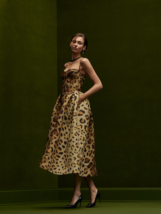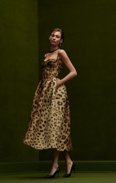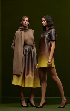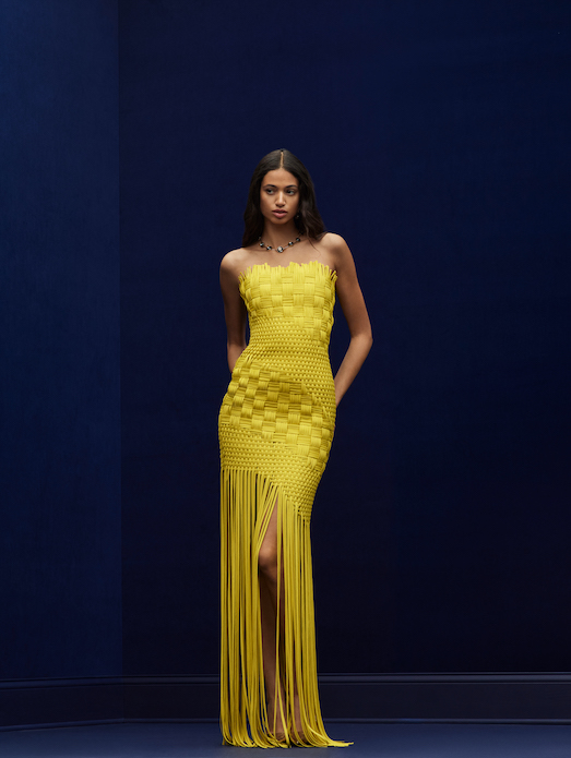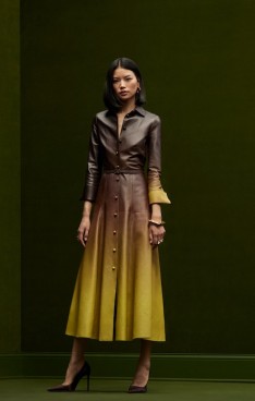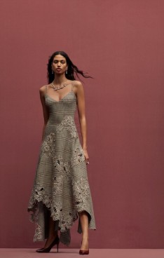 sophisticated silhouettes reveal themselves in refined tailoring, corseted tea-length dresses and structured gowns punctuated with organic hemlines. Novelty fabrics such as a cocoa and ginger ombré leather and a woven basketweave crepe showcase the collection’s innovative techniques.