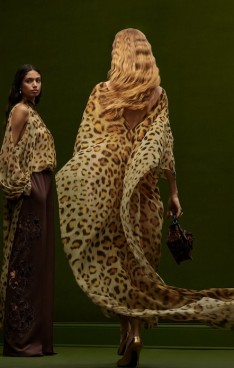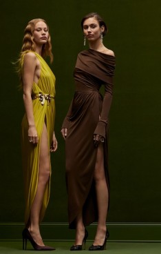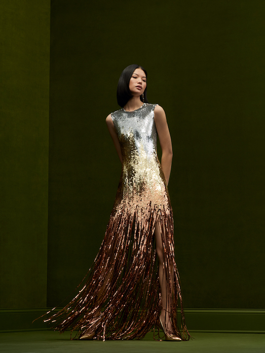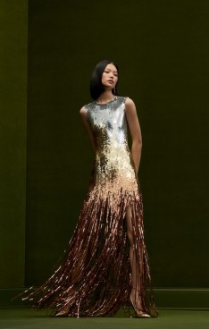 Prominent art nouveau elements come to the fore in eveningwear — highlighted by the sinuous corded crystal cocktail dress, ornamental sapphire ombré crystal column gown, and individually dyed acrylic paillette embellished gowns inspired by stained glass décor.