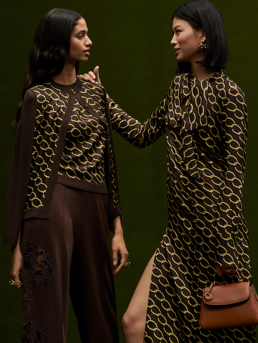 Vibrant hues of ginger, olivine and berry complement the collection staple, cocoa. bold prints such as the jaguar, ‘o’ chain-link and spider chrysanthemum artwork cover classic daywear styles.