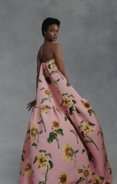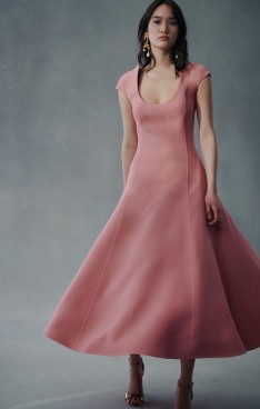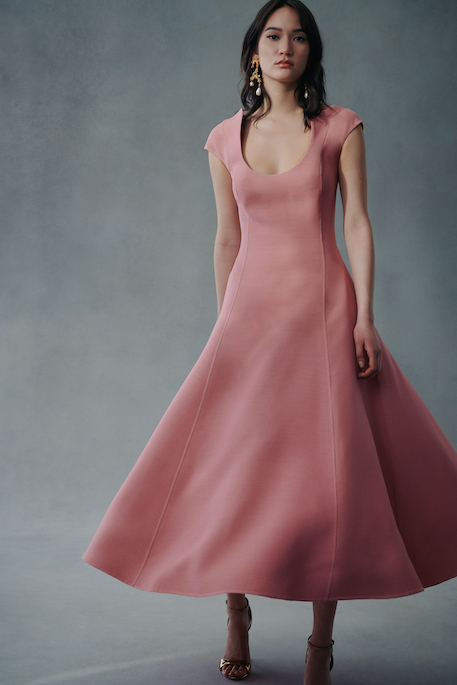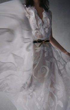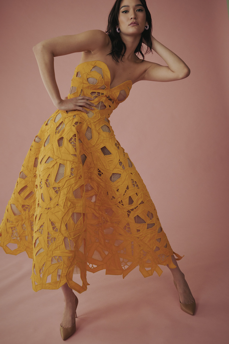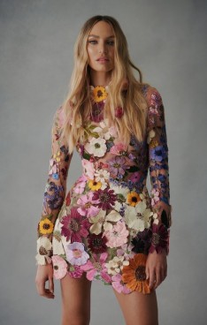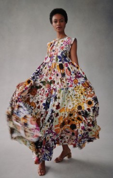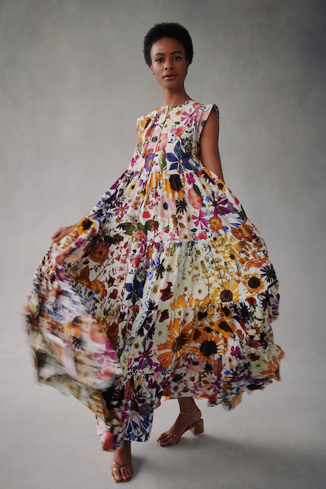 Sunflower prints blossom on day pieces and cocktail dresses, introducing an abundance of tulle. An electric-hued group, pristine in its absence of embellishments, boasts striking colors and undulating fabric.