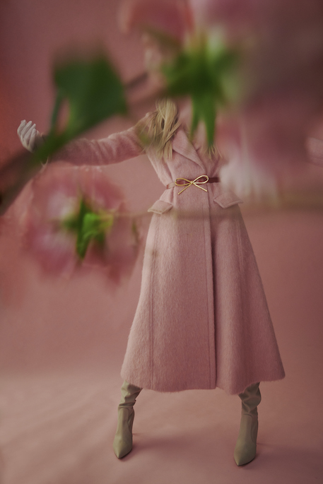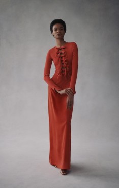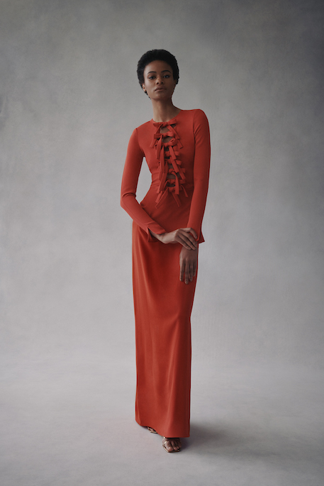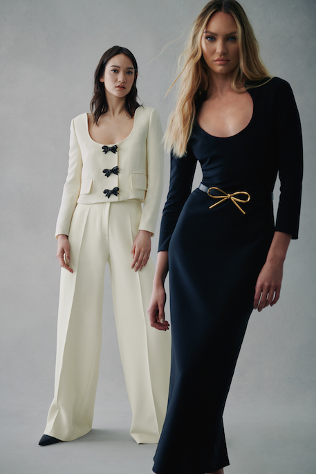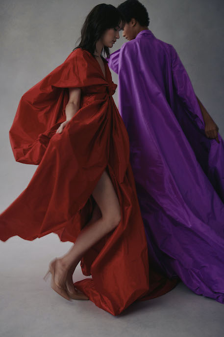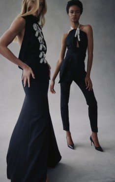 Caftans are richly textured and begin to hint at the bows that evolve throughout the collection. Market flowers wrapped in craft paper and tied with raffia ribbon are the muse behind the concept, with bows rendered in crepe, taffeta, metallics, and crystal.