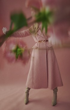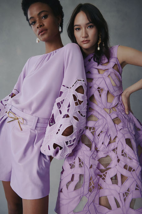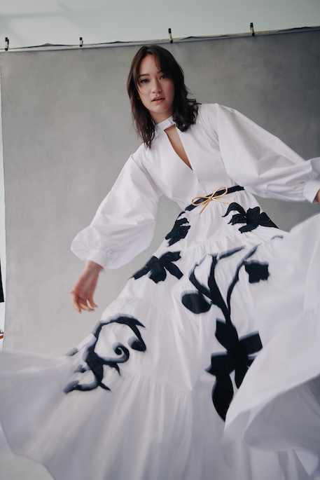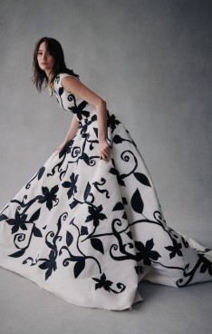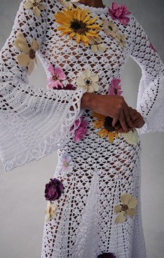 The resulting botanical designs are rendered in articulate threadwork embroidery, crocheting, and multi-colored floral appliques. Fabrics range from fil coupe to cotton to taffeta, culminating in a modern, silk faille ball gown.