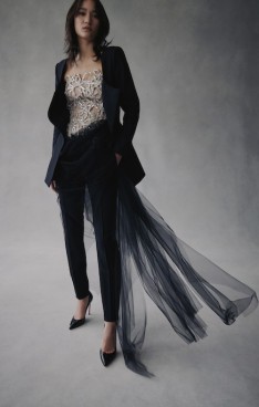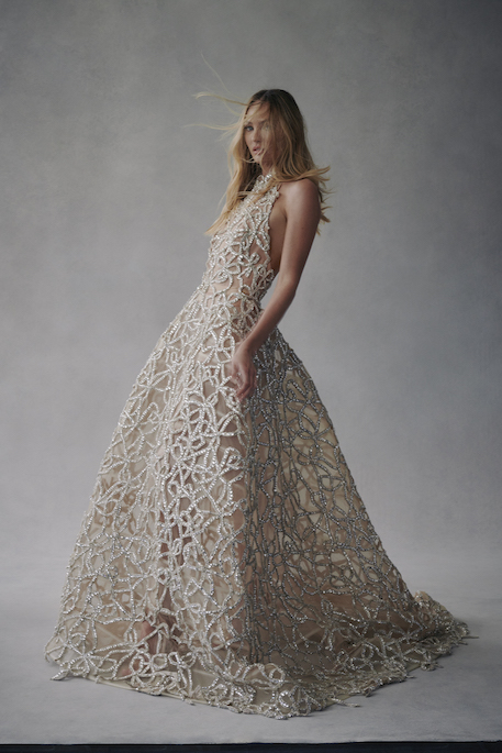 The collection reaches a crescendo with a tulle ball gown, ablaze with crystalized bows and featuring an open back and high neck.