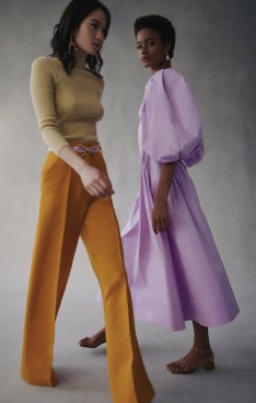 Tailored jackets and dresses are highlighted by a round scoop neck and embellished with metallic belts and ornamental buttons. Tone-on-tone color-blocking reigns for daywear in knits and crepe, elegant in an end-of-summer palette in muted shades of lavender, mint green, turquoise, and saffron.