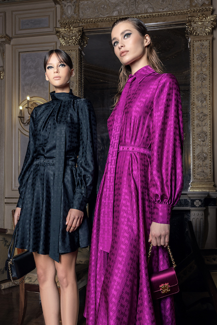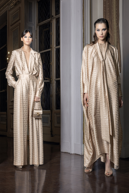 Throughout the cuts, it summons polychromatic 3D ornaments, unfolding at times on the shoulders and other times at the waist. The jacquard with a subtle monogram flows into midi or maxi dresses, or wide-leg pants paired with matching shirts.
