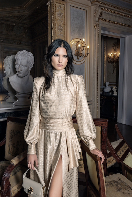 Dresses play with lengths and shapes, while trousers make a captivating appearance. The cady gracefully embraces the body, adorned with sparkling macramé rosettes.