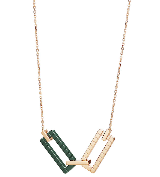 Linear rectangular motifs link frosty rose gold cubes with solid ceramic blocks in a color personally selected by Rihanna – Jungle Green. Crafted from 18ct rose ethical gold certified Fairmined, the 9-piece capsule collection will be available with icy polished or diamond set gold cubes. Pieces will be available in June with pre-orders at all Chopard boutiques.