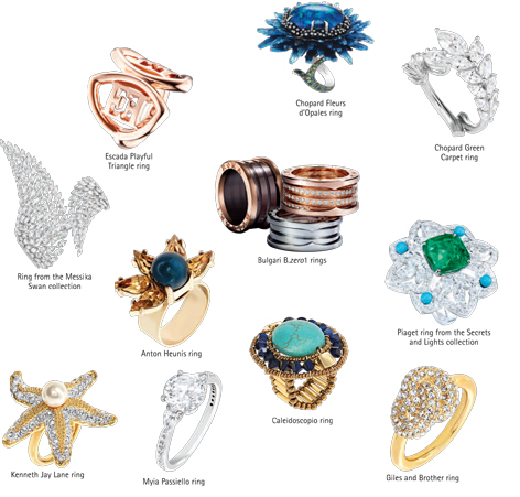 Rings continue to be a big jewelry trend this season. Make a statement and go for something big and bold or be totally on trend and rock the multiple rings on one hand look. If you prefer to keep it simple but high impact, opt for just one big statement ring like the Chopard Fleurs d’Opales or the Melissa Kandiyoti rings. From Piaget’s high jewelry Secrets and Lights ring to the Escada Playful Triangle, you are sure to find something to your liking!