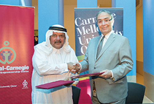 HE Sheikh Faisal bin Qassim Al Thani, chairman of AlFaisal Without Borders (ALF) Foundation, and Ilker Baybars, Dean of Carnegie Mellon University in Qatar, inaugurated the AlFaisal – Carnegie Mellon Innovation Entrepreneurship Center aimed at fostering an entrepreneurial environment and inspiring innovation among Qatar’s university students. The collaboration is a result of a Memorandum of Understanding to promote future collaborations in education, research and community development. The main goal of the collaboration is to foster an environment and inspire a spirit of innovation entrepreneurship within Doha’s university students. The center was launched in the fall of 2015, concurrent with the beginning of academic year 2015-2016, and offers courses on innovation entrepreneurship that are open to all partner universities within Education City throughout the year.