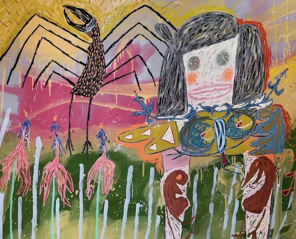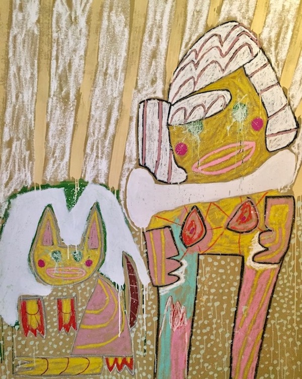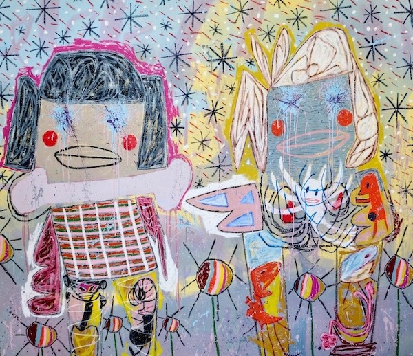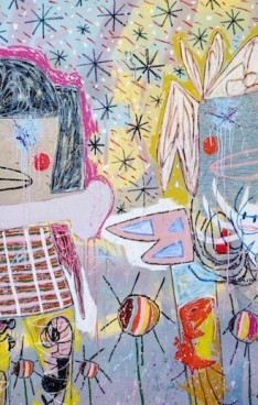 A native of New York, Handler is known for his whimsical, fantastical imagery and faux-naif art practice which he undertakes using a variety of materials, ranging from pencil and oil stick to acrylic paint and crayon. His work often features flat, outlined characters depicted again a contrasting, frenetic background that serves to sharpen the focus on his protagonists. Sometimes, simple phrases such as “maybe you” or “sorry” are included in the work, hinting at a backstory and generating uncertainty amongst his audience.