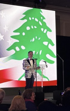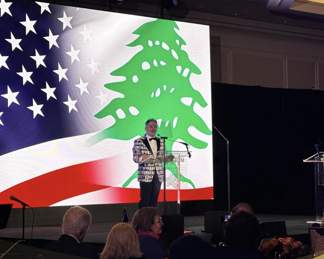Thomas A. Abraham captivated attendees with his entrance, donning a long black coat symbolic of the dark times faced by Lebanon. In his remarks, Mr. Abraham stated that the black coat represents the shadow over Lebanon, concealing aspirations to voice concerns, aid the nation, and preserve the Lebanese heritage and future. In a powerful display symbolizing the intention to shed the dark shadow over Lebanon, he discarded his coat to the ground, revealing a tuxedo jacket adorned with the images of the 241+ lives lost in the Beirut explosion on August 4, 2020, as a visual tribute to those affected by the tragedy, and a reiteration of the Anthony R. Abraham Foundation’s dedication to rebuilding and healing.