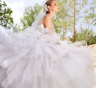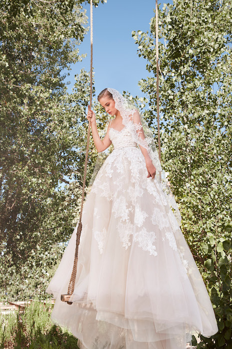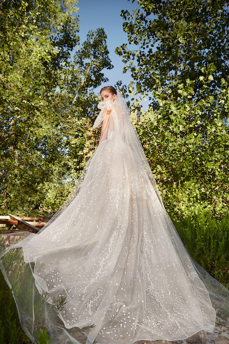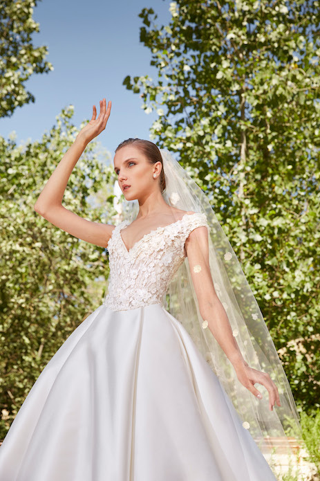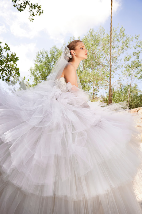 All pristine, each bridal dress moves with its own distinct character. Embroidered tulle organically cascades into flowing trains of silk thread and pearls. Chantilly lace and organza floral appliques, chiffon leaves and petals delicately dance across carefully draped bodices. Structured necklines are accentuated with signature dots and sequins coupled with refined bows of varying volume.