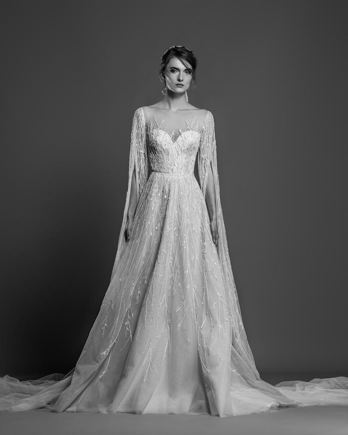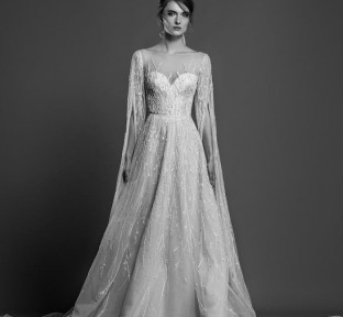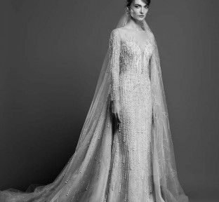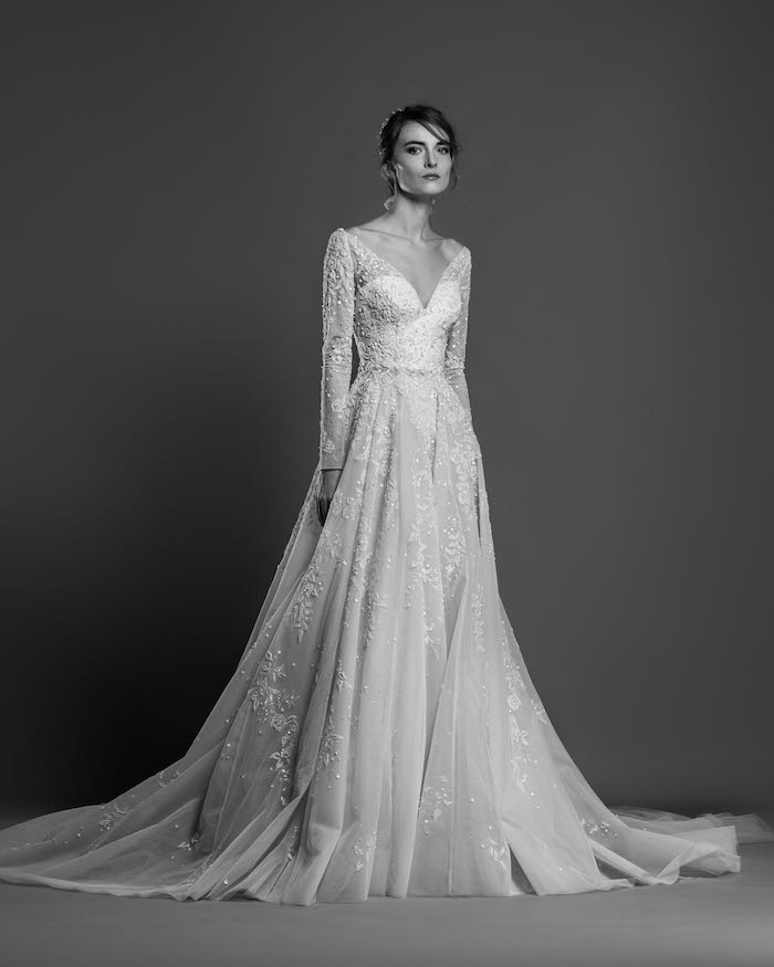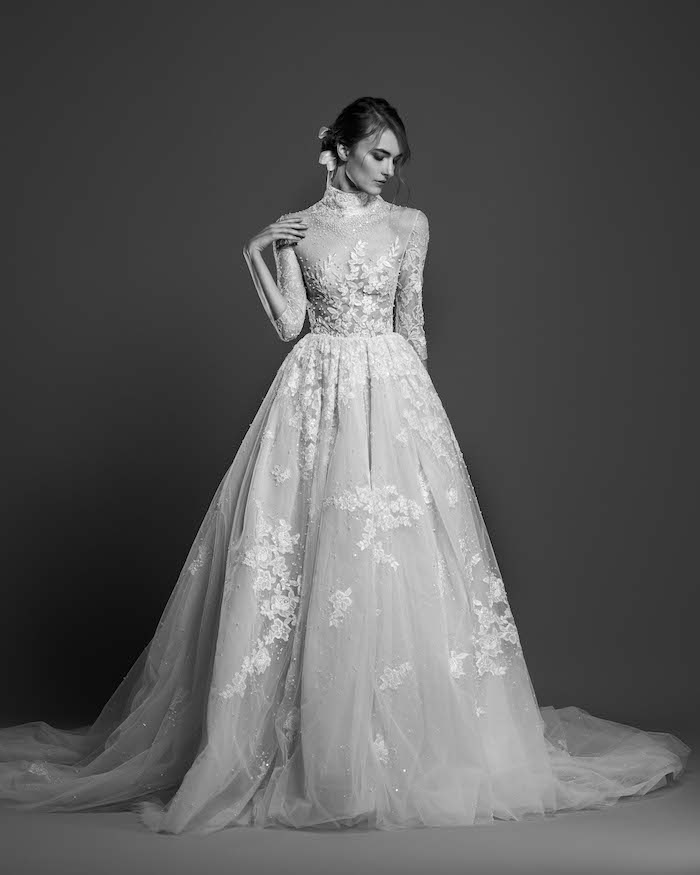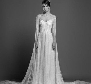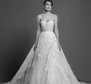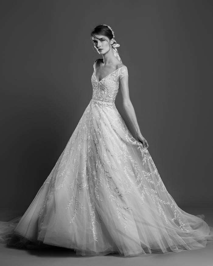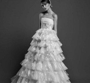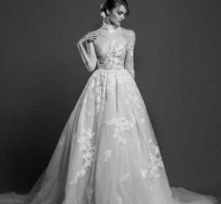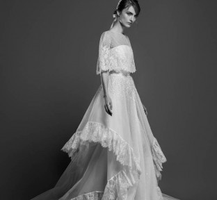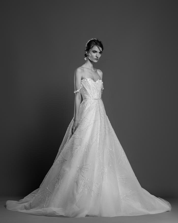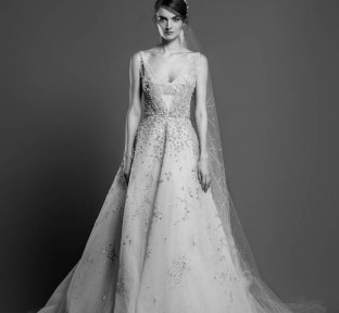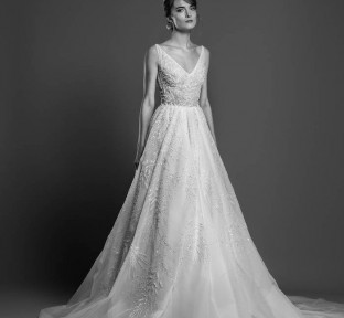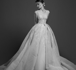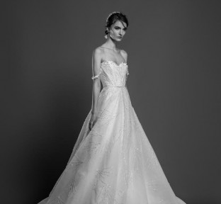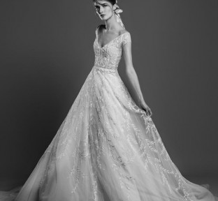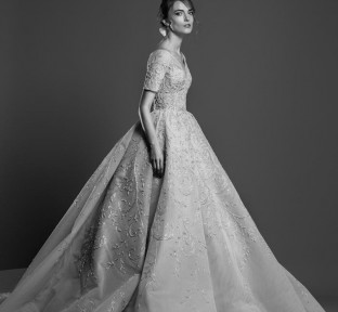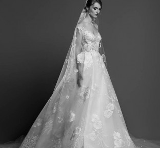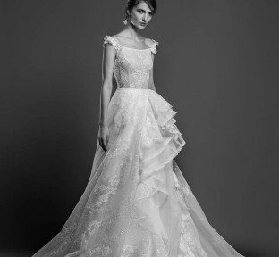 Lace fire illuminates each of the embroidered bouquets that seem to be metamorphosed, thanks to the designer's ability to create the magic of movement and the precision of divisions that manifest as open busts, bare shoulders, voluptuous flounces, sensuals collars ,and dresses as wide as corollas. Sumptuous and feminine embroidery, results of inimitable GEORGES HOBEIKA’s craftsmanship, thrive in a glimmering soft light. Translucent or shimmering whites shape silhouettes, while the flow of iridescent and ethereal tulles punctuates a romantic union between the rapture of an ephemeral flowering and the strength of eternal love.